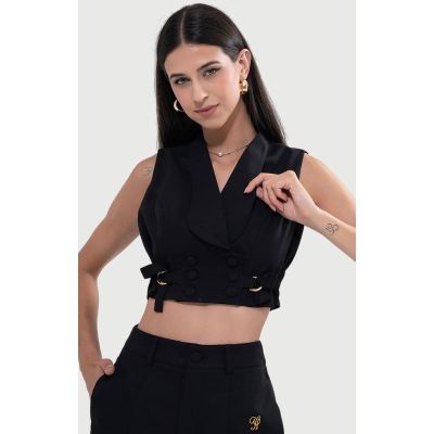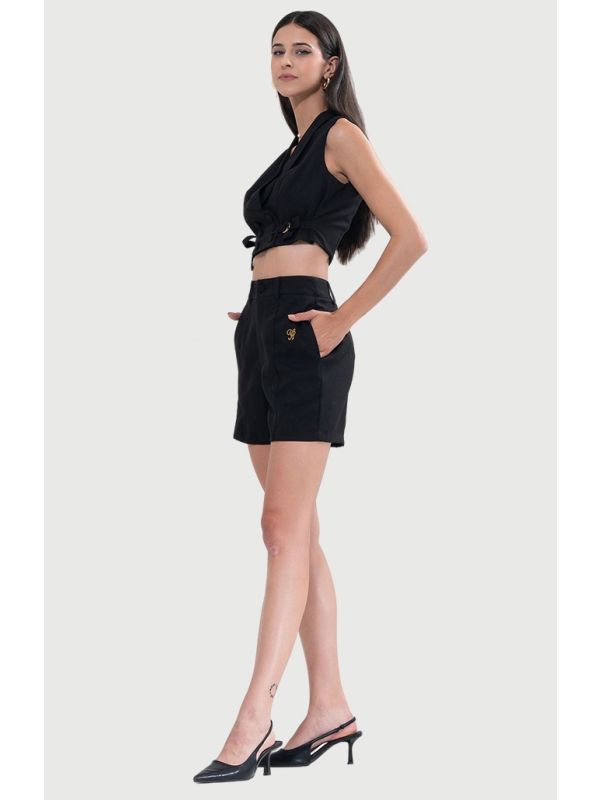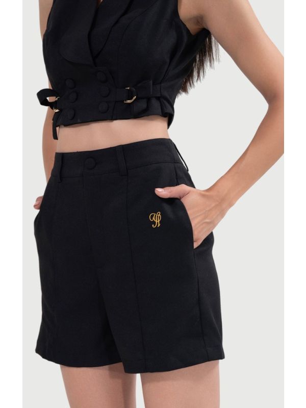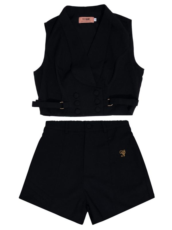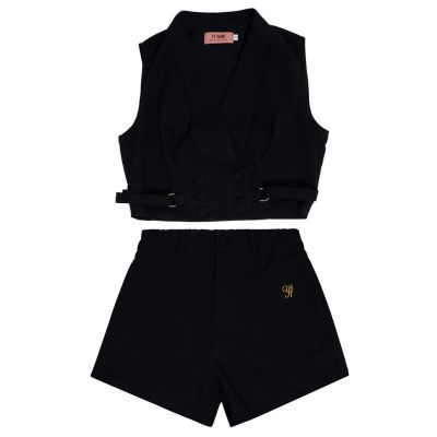 The coordinated high-waisted shorts are made from a structured fabric that complements the vest, designed with a flat front, concealed zipper, and functional side pockets . The sharp tailoring ensures a flattering fit while maintaining all-day ease.